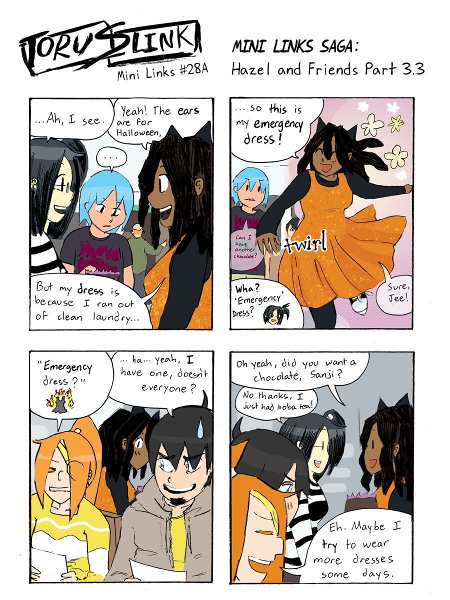 Real-life studio fact: this is what I honestly felt when I wore my emergency dress at the time. Only difference is that mine was blue instead of orange, i.e. a tiny bit less Halloween-themed. Otherwise, I do not remember what kind of candy I gave to everyone (and in the one case, threw out to real-life Ren) — only that it was in fact chocolatey.
